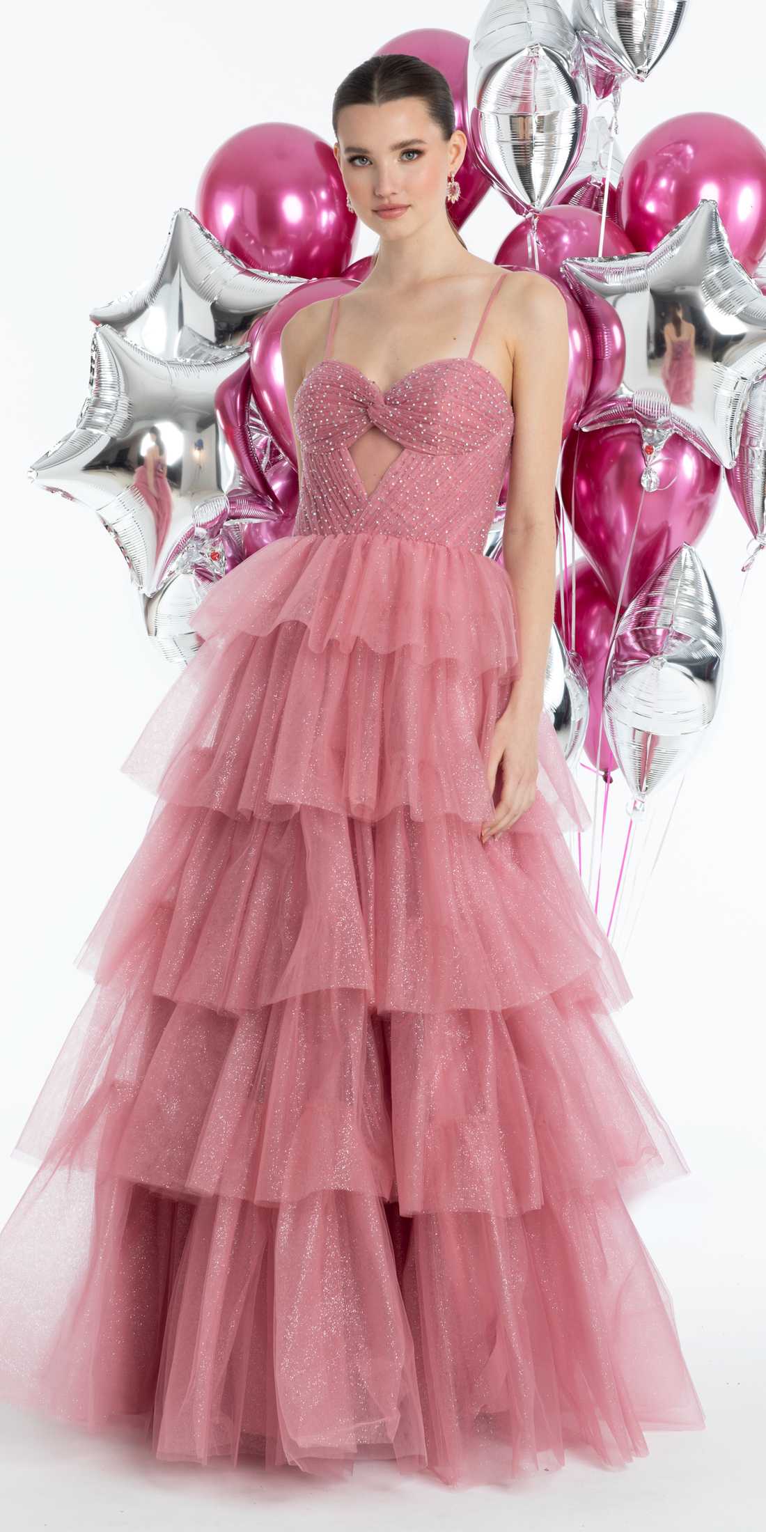 Why have one color, when you can have two? The two-tone trend is another fashion favorite in the prom 2026 style scene. It starts with a soft neutral base color that’s enhanced with a vividly-hued overlay. This look results in ultimate glamour – creating a total look that’s equal parts fierce and demurely sweet all at the same time. Picture nude tones under a gorgeous colored lace overlay comprised of decadent and luxurious fabric, or a soft hue under a more bold mesh overlay – both undoubtedly beautiful in their own special ways. And to amp up even more color to your head-to-toe look, try a bold lip combined with wavy, tousled hair. You’ll be ready for an ultimate memorable night!